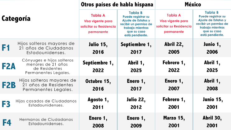 - F2A: Cónyuges e hijos de residentes permanentes legales, que sean solteros y menores de 21 años