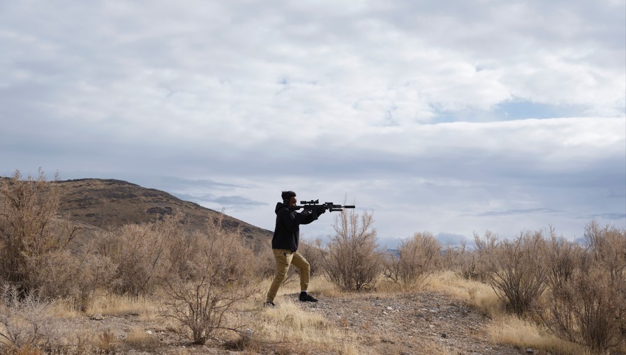 Joseph Osse, que publica bajo el nombre de Grazien Brann, dispara una de sus armas para un video para las redes sociales, en Grantsville, Utah, al oeste de Salt Lake City, el 18 de noviembre de 2024. (Foto Prensa Libre: Lindsay D'Addato/The New York Times)