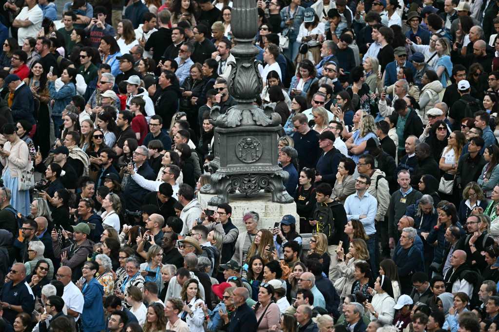 Católicos y turistas esperan la fumata de la chimenea de la Capilla Sixtina durante el segundo día del cónclave.