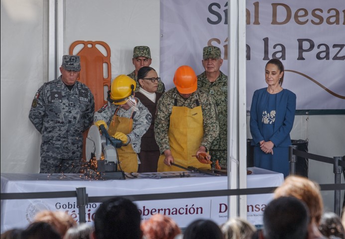 La presidenta de México, Claudia Sheinbaum, observa cómo se destruye un arma de fuego en Ciudad de México en enero. (Foto Prensa Libre: Luis Antonio Rojas/The New York Times)