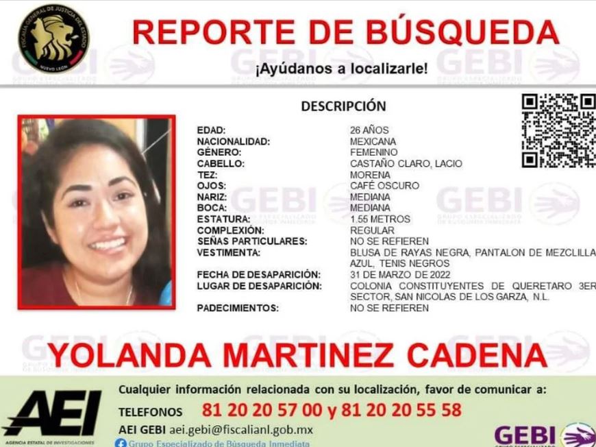 Aunque exista evidencia no se sabe sobre su paradero y, en la alerta oficial de búsqueda, las autoridades mexicanas indicaron que, al momento de su desaparición, Yolanda vestía una blusa de rayas negras, pantalón de mezclilla y tenis negros.