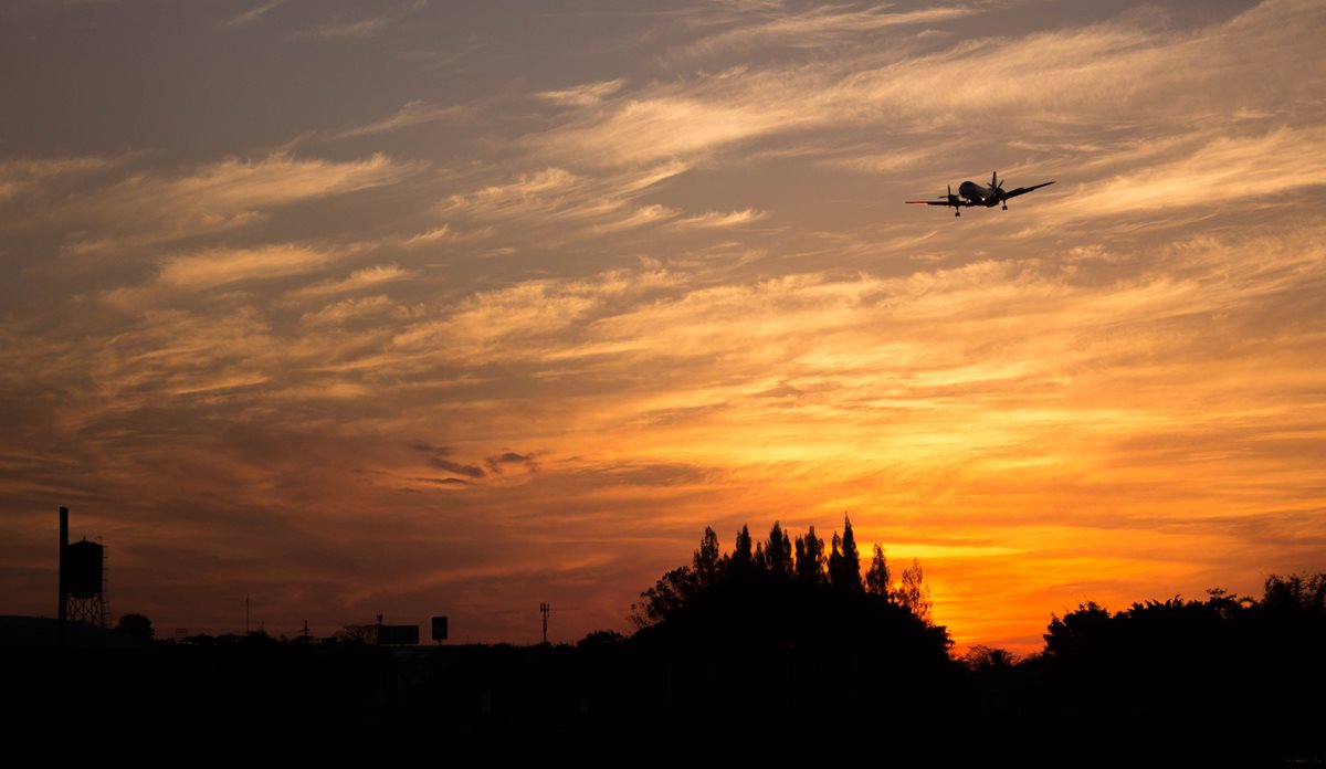 El cielo anaranjado decora el atardecer para un buen aterrizaje en la Isla de Flores.