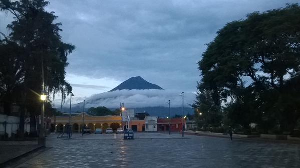 La vista del parque de Jocotenango, en Sacatepéquez, es única, ya que está acompañada de la imponencia del Volcán de Agua.