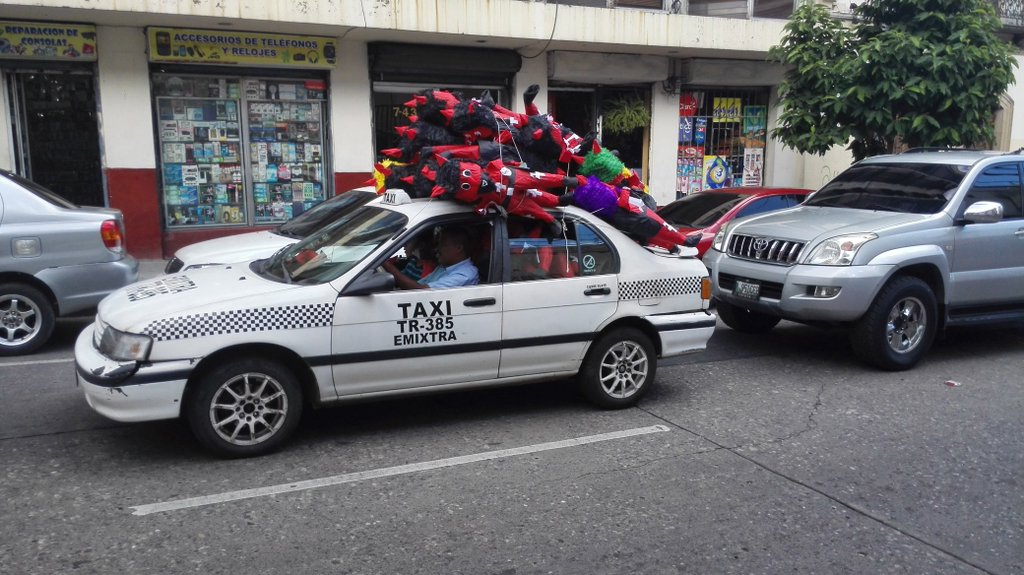 Un taxista llamó la atención cuando trasladaba, sobre el techo del auto, decenas de piñatas que serán quemadas el 7 de diciembre.
