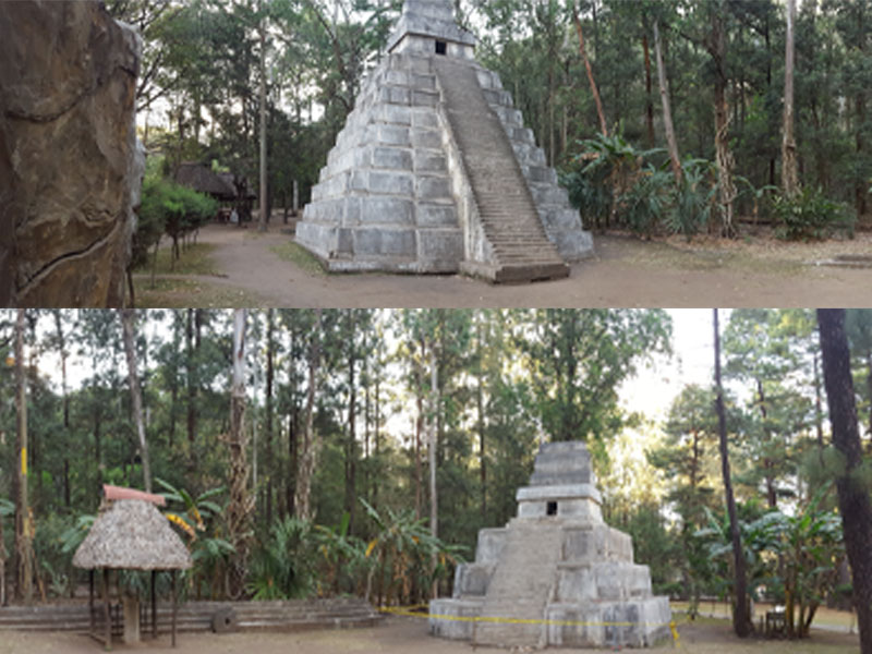 Una réplica de las ruinas de Tikal, se puede encontrar en el parque Naciones Unidas, ubicado en la carretera antigua hacia Amatitlán.
