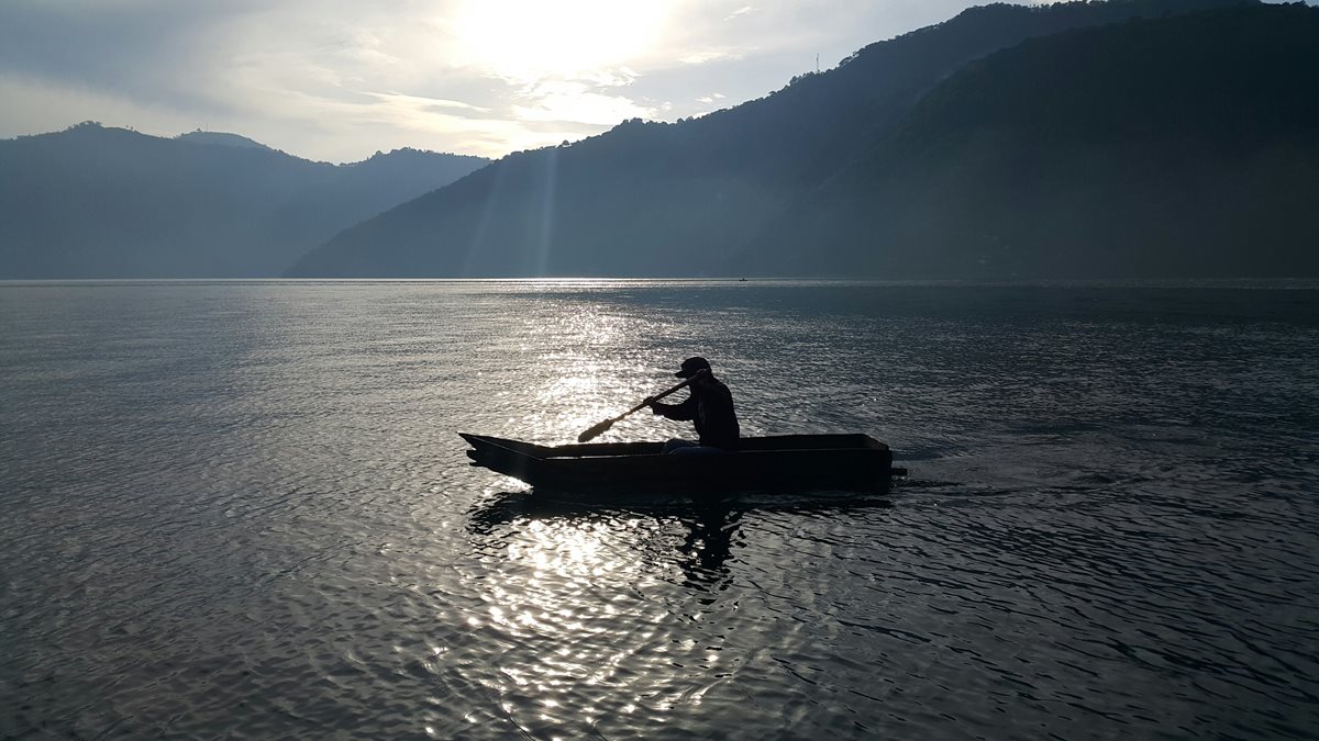 Una persona rema en las tranquilas aguas del Lago de Atitlán durante la salida del sol.