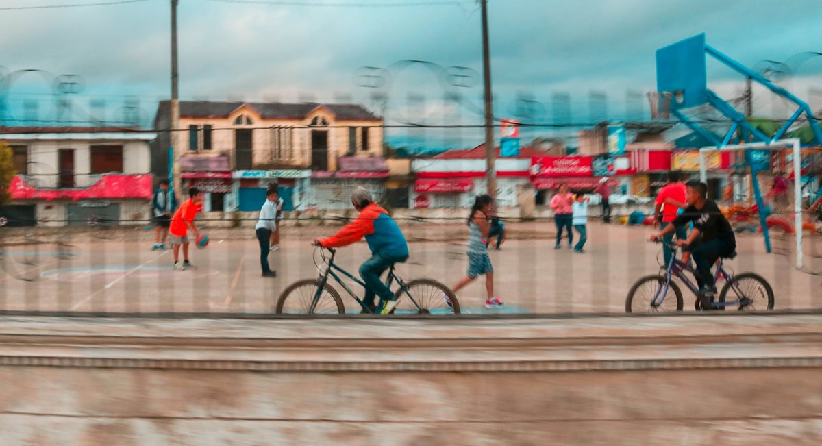 Algunos niños van en bicicleta y otros juegan baloncesto en el parque San Marcos, en Cobán, Alta Verapaz, durante una tranquila y amena tarde dominical, bajo un bello cielo azul.