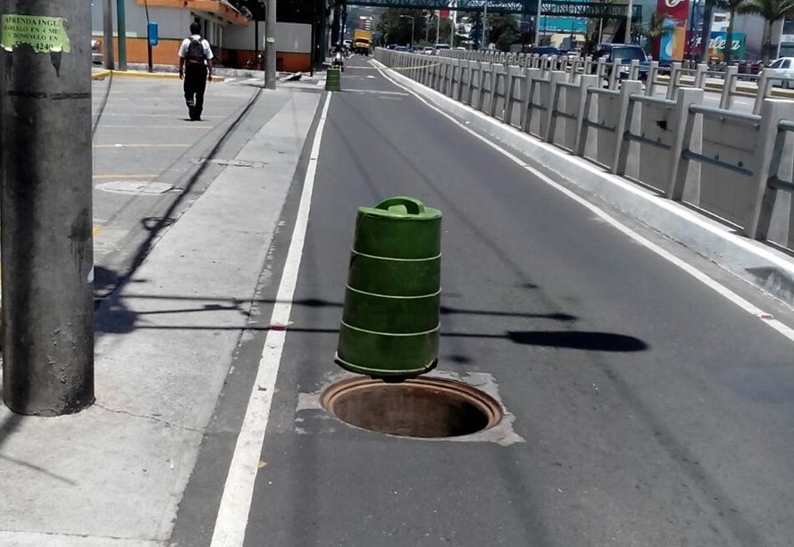 Un lector captó en el bulevar Los Próceres y 21 avenida zona 10, un desagüe que no cuenta con tapadera y la única señal de precaución es un tonel verde. ¿Qué deberían de hacer las autoridades para evitar este tipo de robos?