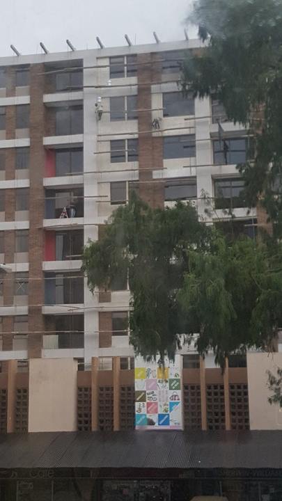 Dos trabajadores fueron captados cuando, desde las alturas, limpiaban las ventanas de un edificio en la ciudad capital. Ambos estaban sujetados por lazos pero ninguno utilizaba casco o algún tipo de seguridad.