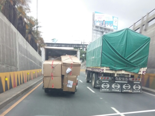 Un camión fue captado en la zona 9 cuando transportaba cajas de grandes proporciones, sostenidas únicamente por delgados lazos.