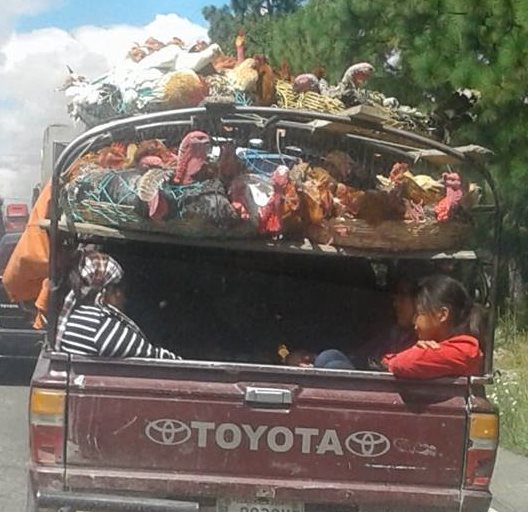 Un lector captó esta imagen en la ruta hacia Huehuetenango, en la que se ve cómo el piloto de este picop ha acomodado la palangana para transportar personas, aves de corral y carga.