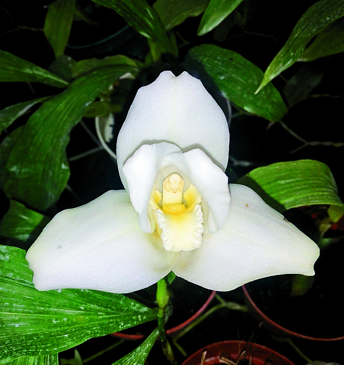 La nívea orquídea Monja Blanca, de tamaño considerable, es una forma semialbina de la especie Lycaste virginalis que por lo general presenta flores moradas (forma virginalis y forma superba).