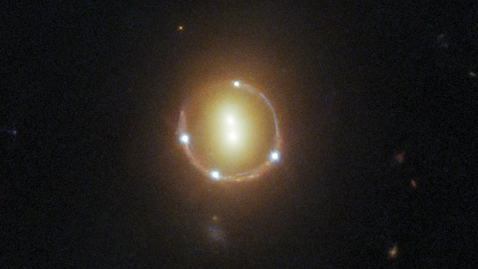 Pero en realidad, esos puntos brillantes no son seis galaxias, sino tres: las dos del medio del anillo y otra que se encuentra detrás de ellas, pero cuya luz es distorsionada y magnificada al pasar por el campo gravitacional de las dos galaxias en primer plano y que entonces luce como cuatro.Debido a que la masa de las dos galaxias en primer plano es tan alta, esto provoca una curvatura gravitacional del espacio-tiempo alrededor del par.