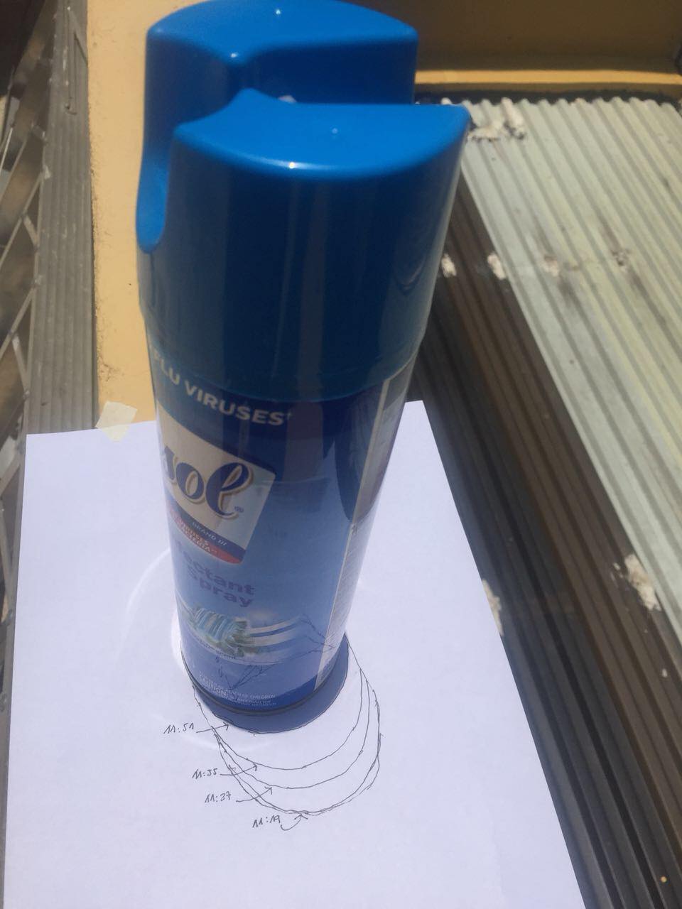 Prepare un lápiz, papel, reloj, cámara y un objeto cilíndrico, como un vaso, envase plástico o botella de vidrio con fondo circular. Empiece unos minutos antes a registrar cómo avanza la sombra y cómo va desapareciendo.