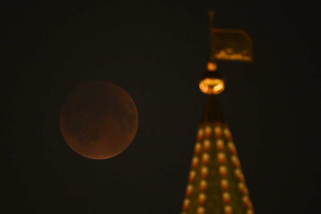 La "Luna de Sangre" se observa durante un eclipse total sobre el centro de Praga, República Checa. (Foto Prensa Libre: EFE)