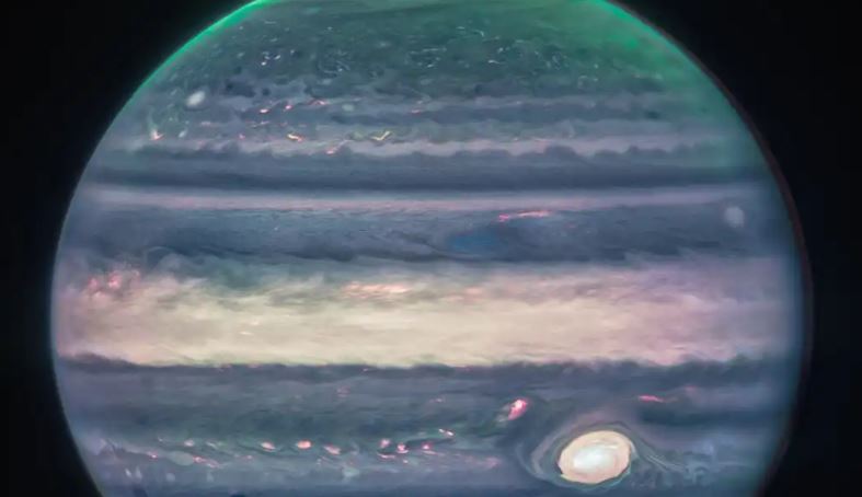 Las fotografías difundidas permiten ver que las auroras se extienden a grandes altitudes sobre los polos norte y sur de Júpiter. Estas imágenes proceden de la cámara de infrarrojo cercano (NIRcam), que tiene tres filtros infrarrojos.
