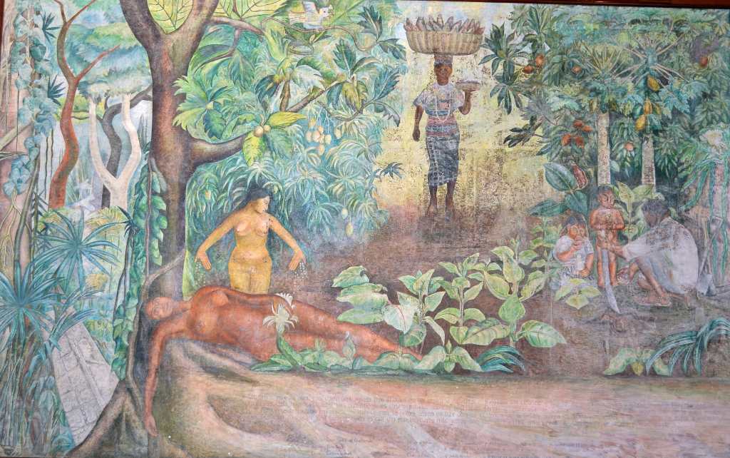 Este mural fue pintado en 1954 por la artista Rina Lazo, quien estudió arte en México, donde fue discípula del muralista mexicano Diego Rivera, según Alfaro. En este mural, ‘plasma la fertilidad de la tierra a través del cuerpo de una mujer de piel morena que está desnuda; una mujer de piel amarilla, que representa el maíz, y una estela semienterrada que simboliza la cultura maya’, explica Alfaro.