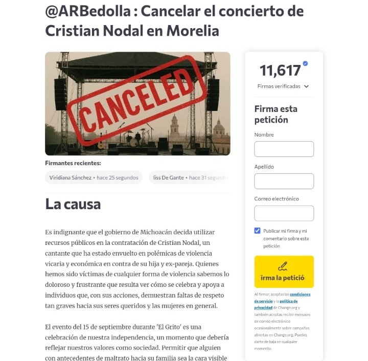 En el caso de Nodal, la petición había superado las 11,500 visualizaciones hasta la tarde del 5 de septiembre. El texto dirigido a las autoridades estatales expresa: “Es indignante que el Gobierno de Michoacán decida utilizar recursos públicos en la contratación de Christian Nodal, un cantante que ha estado envuelto en polémicas de violencia vicaria y económica en contra de su hija y expareja”.