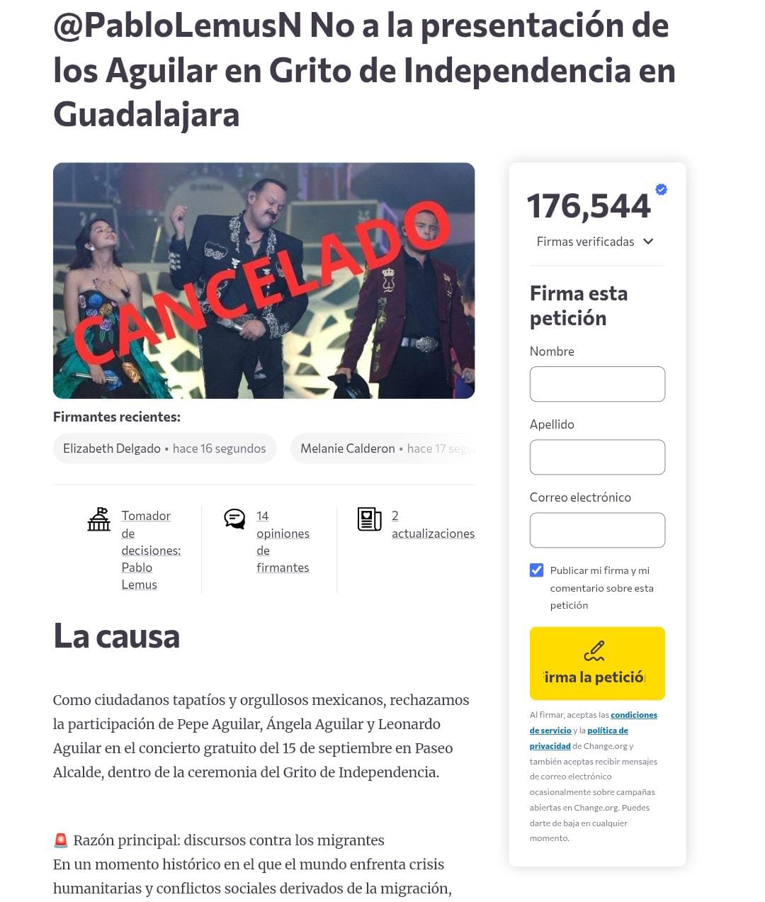 La solicitud, publicada en la plataforma Change.org, se suma a otra impulsada por pobladores de Guadalajara, quienes exigen la cancelación del concierto de Pepe Aguilar y sus hijos, Leonardo y Ángela Aguilar, como parte de los festejos patrios en el Centro Histórico de esa ciudad.