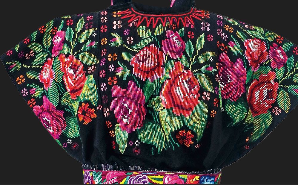 En el diseño del cuello de este huipil se observan unos picos en todo su alrededor, en alusión al sol, elemento característico del lugar y apegado a la concepción k’iche’ del Universo. En el resto del huipil predominan grandes motivos florales, inspirados en el entorno de las tejedoras.