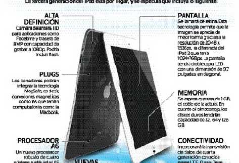 “Hasta el momento solo existen rumores de lo que podría incluirse en la nueva versión del iPad, pero es casi seguro que contará con un procesador A6 —cuatro núcleos—, navegará con mayor velocidad gracias a la red 4G, incorporará una mejor pantalla, duplicará su memoria RAM de 512 KB a 1 GB, y contará con un sistema operativo OS 5.2 o 5.3 entre otras funciones”, explica Rodas.
