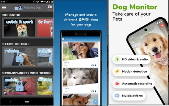 Relax my dog contiene una selección de música para tranquilizar al perro en situaciones estresantes como quema de fuegos artificiales o viajes. Relax my cat se usa con este mismo objetivo, pero en gatos hiperactivos, con ansiedad o estrés, con música o programación televisiva especializadas. Pet Phone permite llamar a la mascota para verla y hablar con ella en tiempo real con un sistema en el que un teléfono o tableta se queda en casa con el perro o gato, montado en un trípode, que se activa con la videollamada.