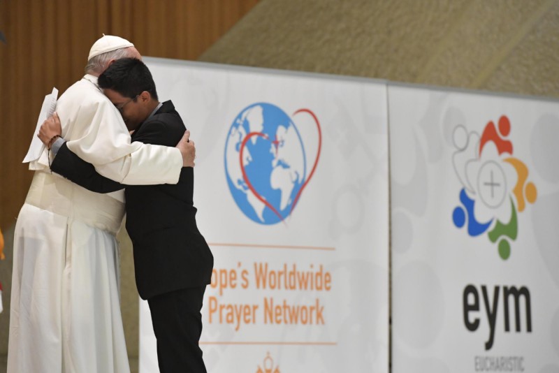Abrazo entre el papa Francisco y Diego Martínez, el primer guatemalteco en la Red Mundial de Oración del Papa. (Foto Prensa Libre: Cortesía Diego Martínez)